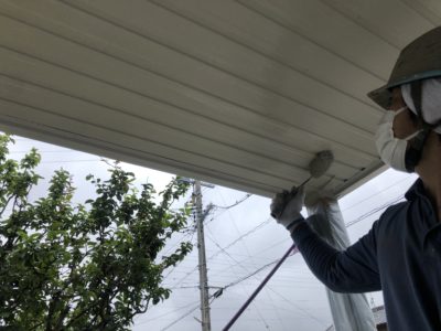 こちら玄関に繋がる玄関軒天を塗装している写真になります。